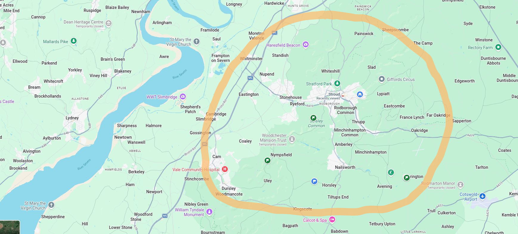 For a home visit, I charge an additional cost to cover my travel time and costs. For somewhere within a 10-mile radius from Stroud (approx. within the orange line on the map below), my call out fee is £75, which includes my first hour of work. If we meet at The Long Table in Brimscombe or at the Stroud Library, I won't charge for travel fees.